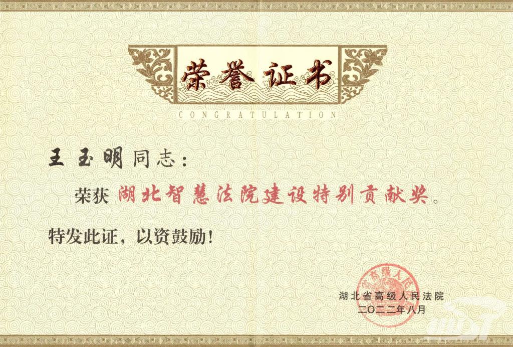 近日,湖北省高级人民法院向我校发来感谢信,感谢bat365在线登录入口王玉明副教授在湖北省高级人民法院挂职期间敢于担当、主动作为,积极参与湖北法院信息化建设工作,为打造智慧法院建设“湖北模式”做出了重要贡献;并决定授予王玉明同志“湖北智慧法院建设特别贡献奖”。