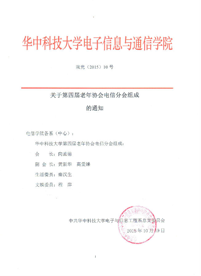 院党(2015)10号 关于第四届老年协会电信分会组成的通知