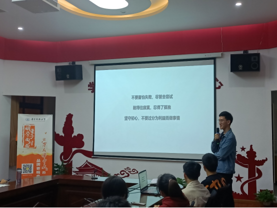 陆骋同学则以“红蓝白”为分享主题,情感真挚地为同学们讲述了代表家国情怀的“红色”和代表科研竞赛的“蓝色”含义,回顾了他在国旗仪仗队、校青马班、成为抗击新冠疫情志愿者、参加研究生支教团之际体会到的家国情怀与初心使命。他以本次获得第七届“互联网+”全国金奖的科研经历,告诉同学们在科研的道路上没有一帆风顺。最后,他祝愿同学们的大学生涯是由红色、蓝色和代表其他精彩生活的丰富颜色一起构成的一片光明的“白色”。