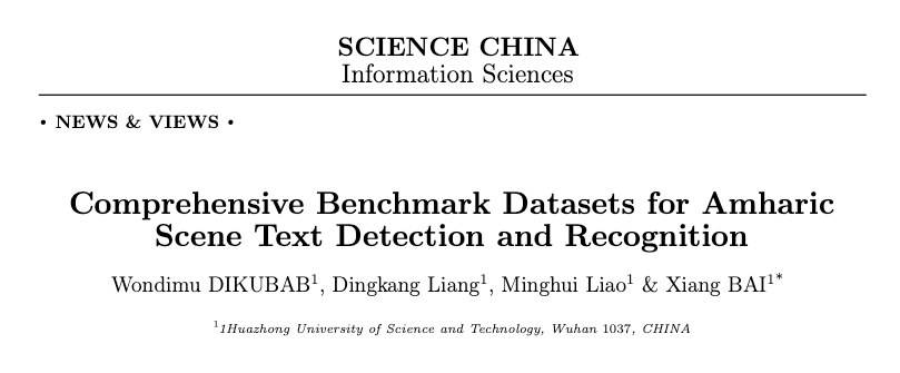 近日bat365在线登录入口2019级来华留学博士研究生王兴(WONDIMU GEBRE DIKUBAB,埃塞俄比亚籍),发布了首个阿姆哈拉语场景文字检测与识别综合公共数据集和初步的算法解决方案论文“Comprehensive Benchmark Datasets for Amharic Scene Text Detection and Recognition”发表在国内计算机领域顶级期刊SCIENCE CHINA Information Sciences》上。