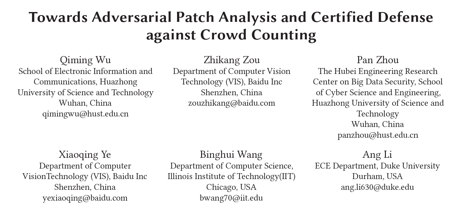 202174日,计算机多媒体领域最权威的国际顶级学术会议 The 29th ACM International Conference on Multimedia (ACM MM2021) 公布了2021年录取论文,bat365在线登录入口bat365在线登录入口18级本科生吴启铭同学以第一作者身份的论文 ”Towards Adversarial Patch Analysis and Certified Defense against Crowd Counting” 被录用!