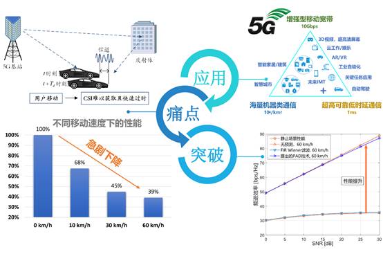 成果简介:5G在实地部署中遇到了一个现实的挑战——“移动性难题”:与用户静止或低速移动环境相比,5G的关键性能指标在中高速移动环境下急剧下降。该问题已经成为当前阻碍5G高速数据传输的最大痛点。团队提出了一种基于无线信道的角度、时延、多普勒信道结构特征和5G Massive MIMO的极高空时分辨率的PAD信道预测技术。理论分析与实验验证都表明该技术可以使5G在中高速环境下的性能逼近静止环境的性能。