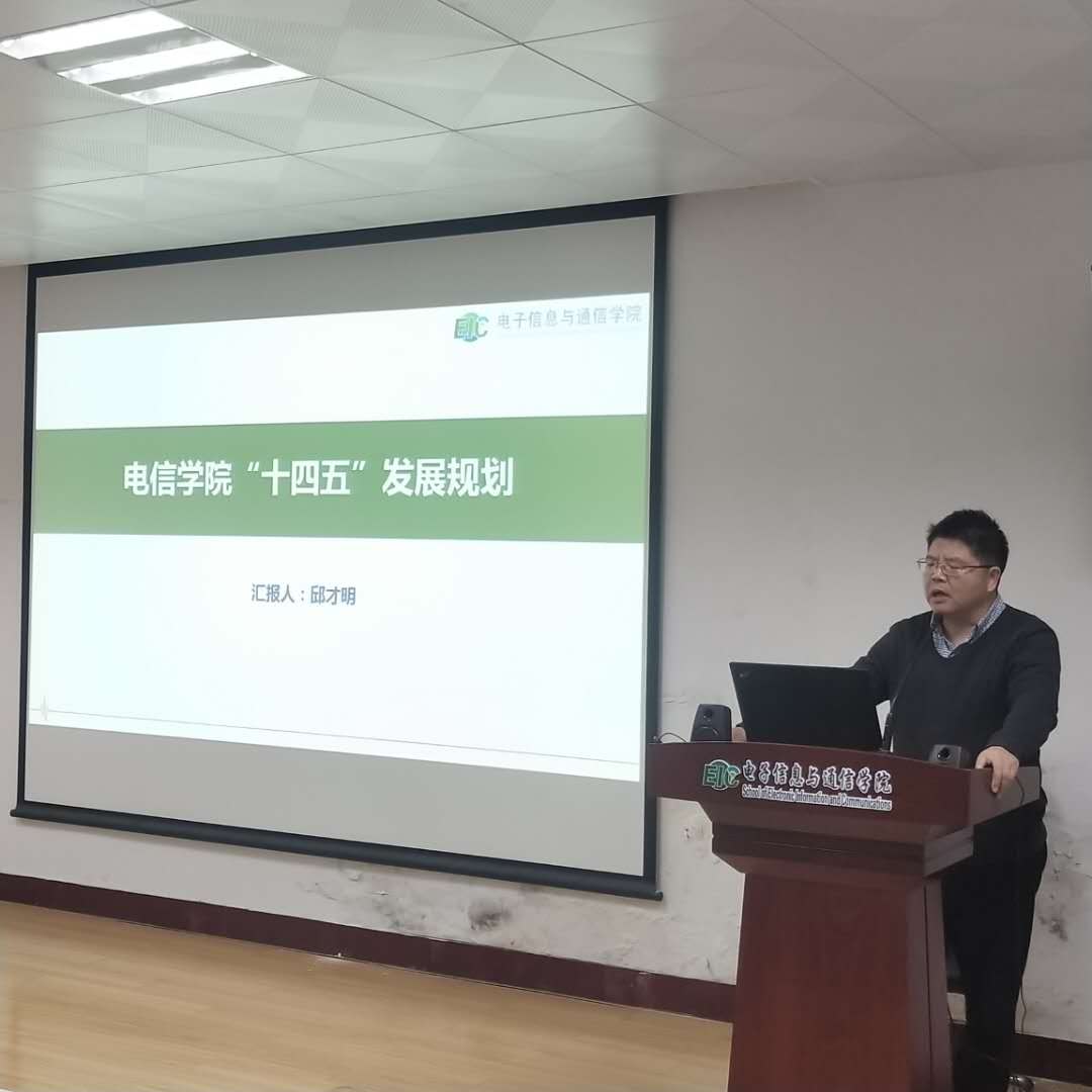 院长邱才明做了学院“十四五”发展规划的工作报告。他从“十三五”回顾、“十四五”规划思路、未来工作任务的全面落实与保障三个方面进行了阐述。他全面总结了学院在“十三五”期间各方面取得的工作成绩和建设成果,分析了存在的问题和不足;详细介绍了学院在谋划编制“十四五”规划的基本思路:紧紧遵循“脱虚就实,突出交叉,四个面向“精神,服务国家需求,需求带动问题,问题带动原创,做未来可期的研究;筹建通信、感知和人工智能交叉创新研究平台,大力推进院内学科交叉;强化系统性、前瞻性谋划,主动推进校内学科交叉;以服务国家战略需求带动面向未来的原创研究,凝练重点建设方向,聚焦下一代无线通信、工业大数据、区块连和网络安全、目标探测与环境感知、脑认知与人工智能等重点方向,发挥优势专长、加强学科交叉,开展大创新、大工程、大项目;以为国育才为第一责任,多举措提高人才培养质量。以学科发展为第一要务,通过“引智计划” 、“青苗计划”、“青团计划”等加强人才队伍建设,通过“攀峰计划”、“突破计划”积极培育重大成果;以平台聚人、以大事聚人、以创新聚人,集结大团队,承接大任务,培育大成果;他和大家一同展望了初步规划的发展蓝图,通报了实现目标的相应举措。他号召全院上下坚定信心、鼓足干劲、善做善成,力争在“十四五”实现学科建设重大突破和学院跨越式发展,强调做实事,撸起袖子加油干,齐参与,发展才是硬道理。