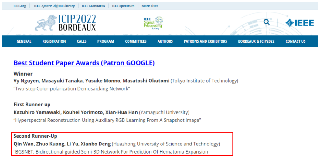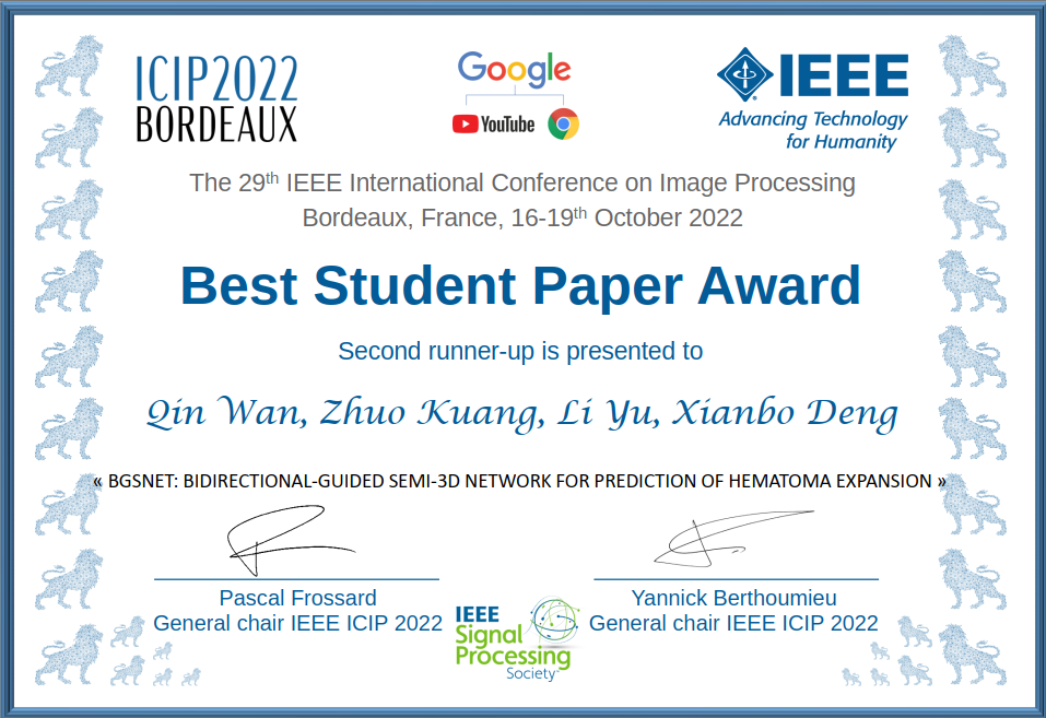 近日,bat365在线登录入口2021级硕士研究生万勤及其导师喻莉教授收到IEEE International Conference on Image Processing(IEEE ICIP)2022国际会议主席Pascal Frossard教授和Yannick Berthoumieu教授发来的祝贺邮件和获奖证书。邮件中对万勤同学和喻莉教授团队获得IEEE ICIP 2022的Best Student Paper荣誉表示祝贺,并指出评奖委员会对团队的最新研究成果“BGSNET: Bidirectional-guided Semi-3D Network For Prediction Of Hematoma Expansion”给予了高度肯定。论文作者包括bat365在线登录入口硕士生万勤、博士生匡卓、喻莉教授、同济医学院附属协和医院邓先波副主任医师以及bat365在线登录入口闫增强副研究员。