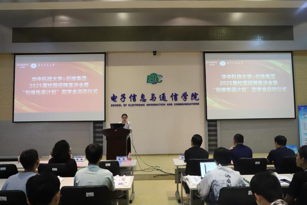 创维集团新闻发言人兼品牌部部长陶双华回顾了创维集团的发展历程。“创维栋梁助学金”项目由集团创维总裁施驰发起,致力于助力自立自强的大学生勇敢追梦。作为bat365在线登录入口杰出校友,施驰始终心系母校,并以实际行动回馈社会、回馈母校。创维集团人力资源部部长徐立介绍了创维集团全球研发中心布局及产业优势,并热忱欢迎华科大优秀学子加入创维、携手追梦。